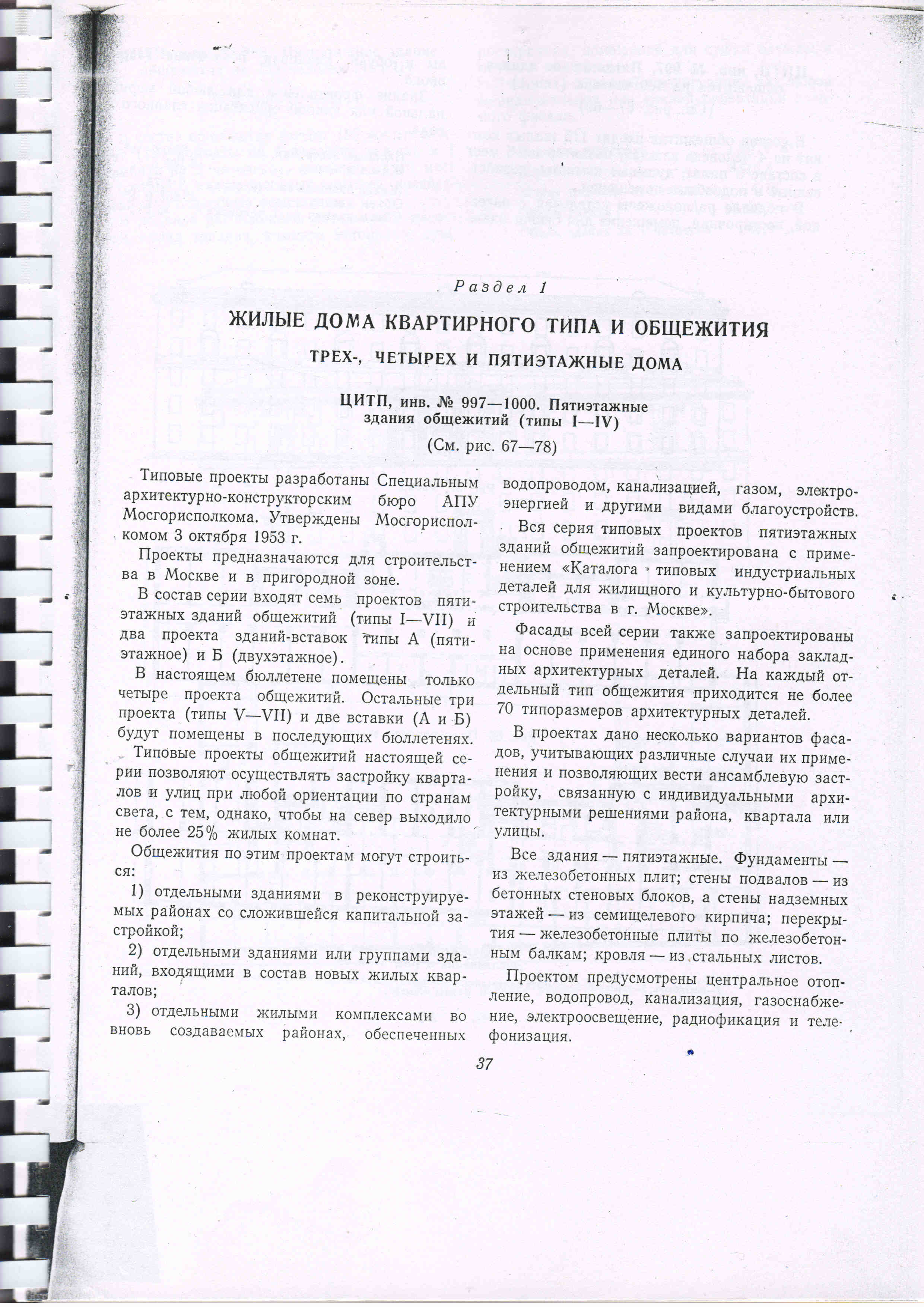Специальное архитектурно-конструкторское бюро АПУ Мосгорисполкома. Серия типовых проектов ЦИТП №№ 997-1000. Проекты утверждены 3 октября 1953 г.