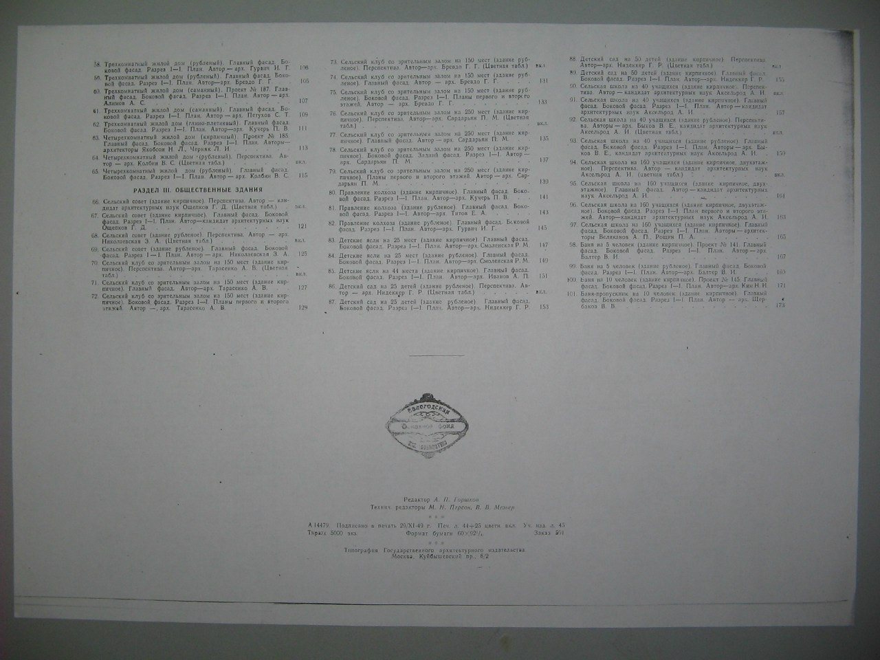 Серия типовых проектов сельских жилых домов Архитектурной школы-мастерской академика И.В. Жолтовского. Архитекторы И.В. Жолтовский, В.В. Васильева. Проекты оград П.И. Скокана. Проекты рекомендованы Приказом № 684 Комитета по делам архитектуры при Совете министров СССР от 29 июня 1949 г.
